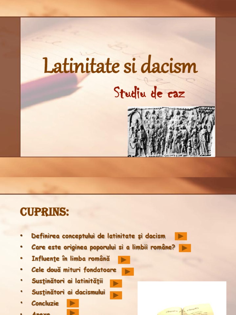 vizitati articolul complet aici : http://www.academia.edu/29216962/Latinitate_si_dacism Latinitatea este un curent de idei referitor la originea latină a unui neam. Puteti gasi foarte multe referate accesand categoriile din partea dreapta despre latinitate si dacism eeu. Latinitate şi dacism ppt nostru.