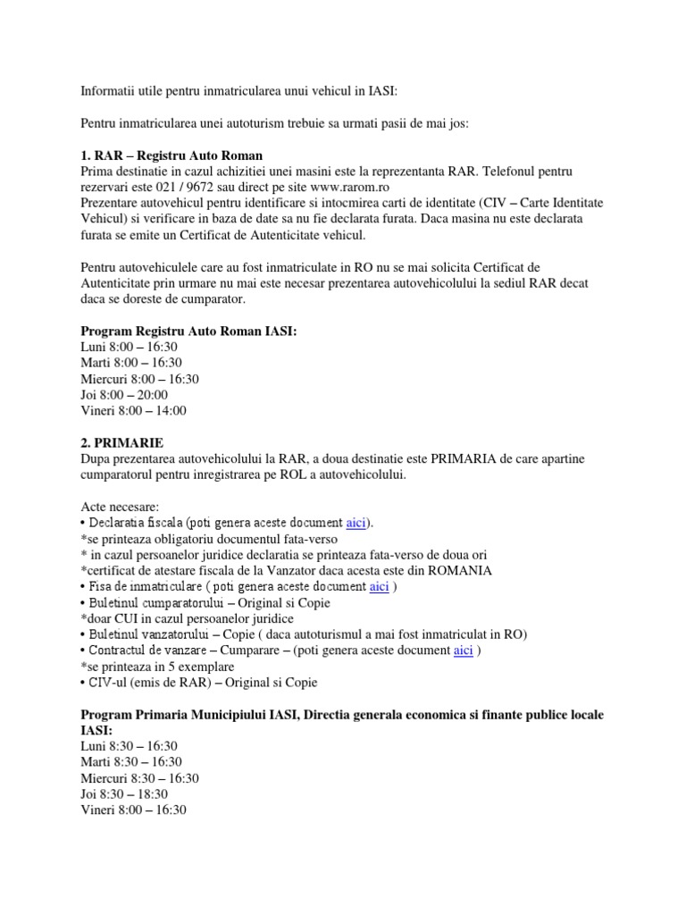 vizitati articolul complet aici : https://fdocumente.com/document/3-3-fisa-inmatriculare-auto.html La iata ie in localitatea 5. Inscrierea autoturismului la directia impozite si taxe a sectorului aferent. Doriti sa efectuati inmatricularea unei masini in iasi si nu stiti procedura de inmatriculare auto ?
